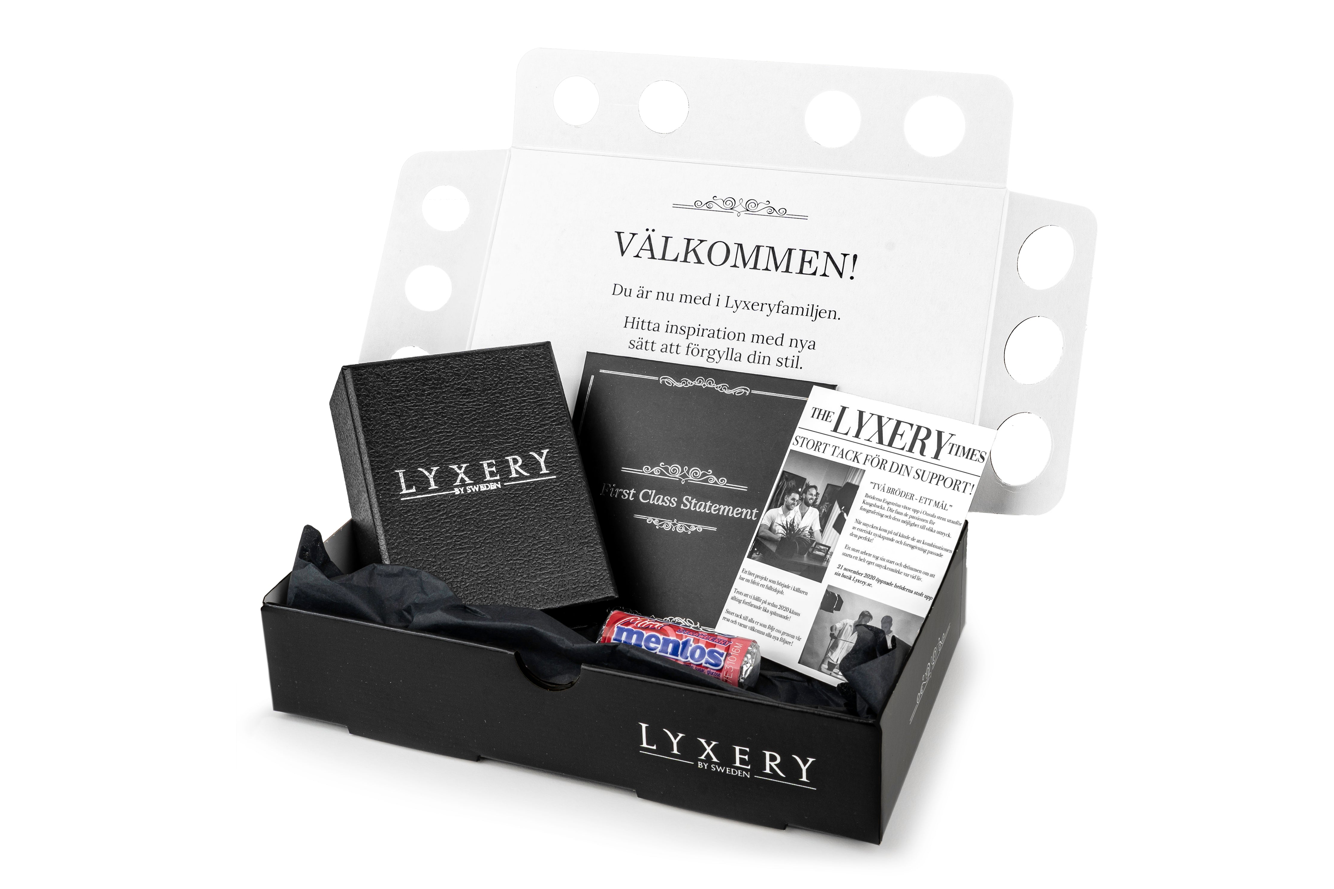 När du får hem ditt smycke ligger det varsamt placerat i en elegant ask tillsammans med en putsduk, kort och något gott att tugga på medans du testar dina smycken.