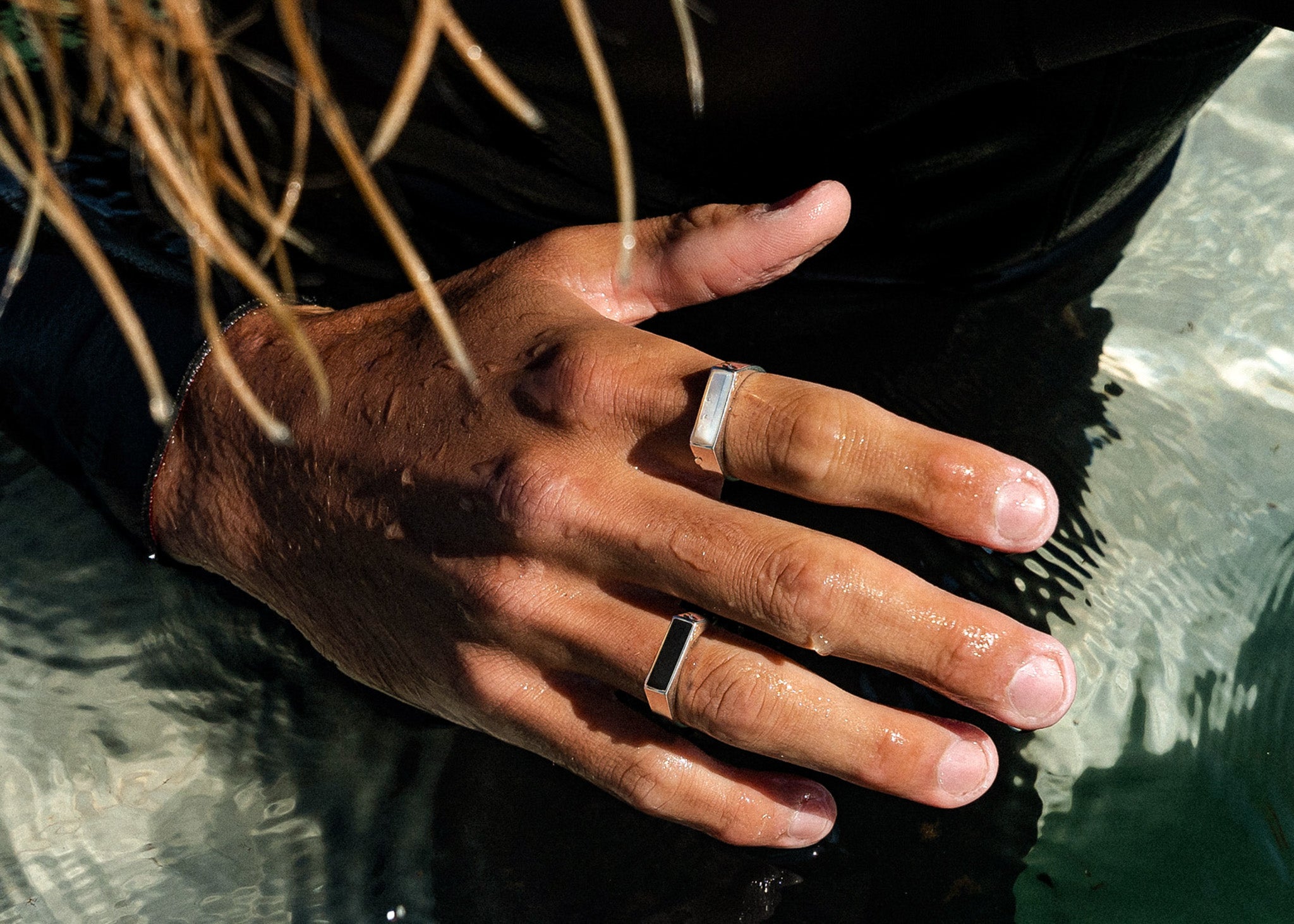 Den smala designen gör att ringen inte dominerar utan istället kompletterar andra accessoarer och klädesplagg på ett harmoniskt sätt. Den svarta onyxstenen ger en sofistikerad kontrast till både ljusa och mörka klädfärger, vilket gör ringen otroligt mångsidig.